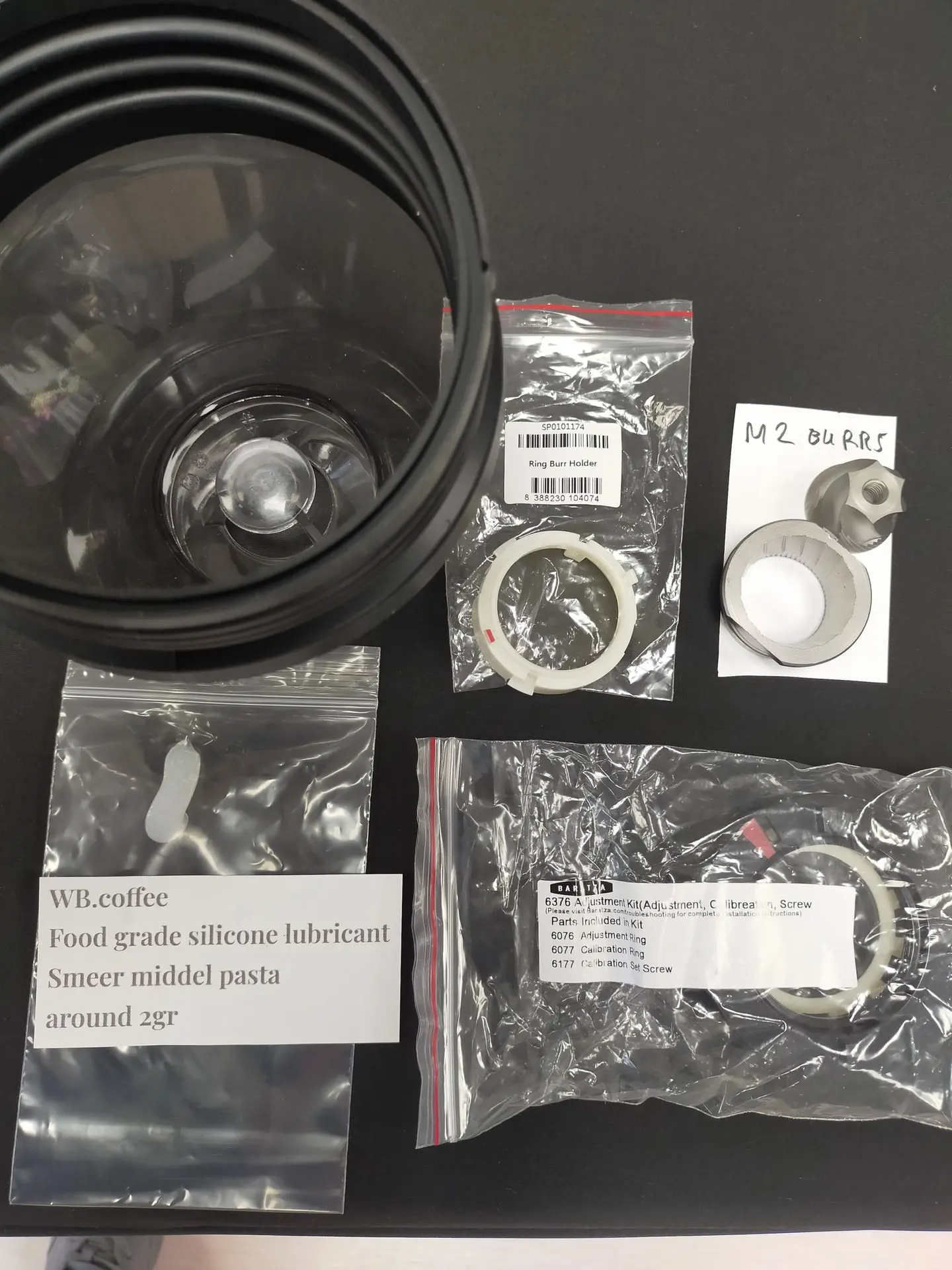 Grinder ring burr holder ring and M2 ring burr can be ordered seperately. Use food grade lubricant and don't forget to add grinder cleaner and a bellow.