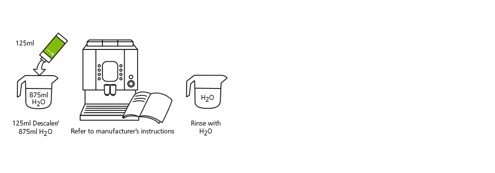 - Add 125mL of Organic Descaler to 875mL of water to make up 1L of descaling solution.