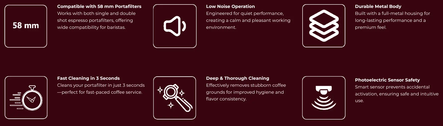 The T1 Portafilter Cleaner by Kaffee Klar is designed to clean 58 mm single and double portafilters quickly, safely, and consistently — perfect for professional espresso bars, roasteries, and busy coffee stations.